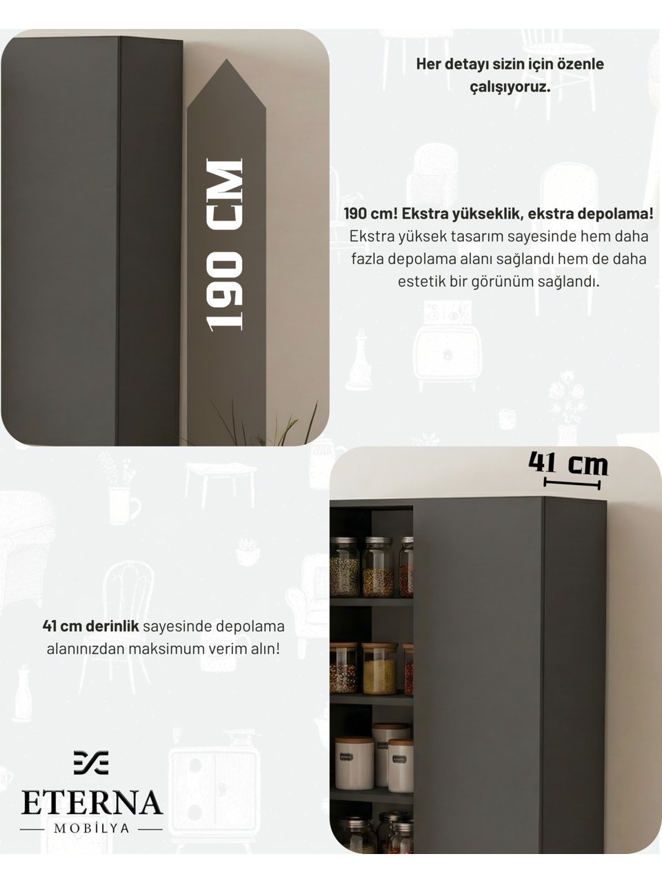 - • Çünkü biz mobilyayı sadece bir eşya olarak görmüyoruz. Eterna Mobilya’da her ürün, uzun yıllar keyifle kullanılacak bir yaşam parçası olarak tasarlanıyor.